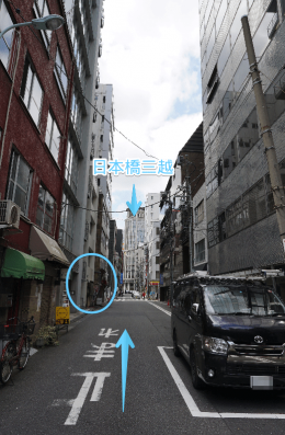 8.日本橋三越が見える通りを進むと、日本橋TNビルの入り口が見えてきます。