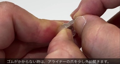 アライナーは歯にピッタリとはまっているので、爪が長い人や短い人はフックにゴムが上手く引っかけられないことがあります。ゴムの付け方にはコツがあるのでそれをご紹介します。