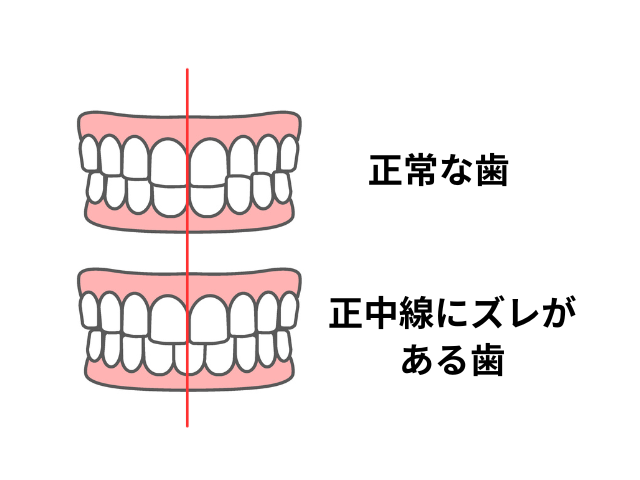 正常な歯並びの方は、上の歯と下の歯の中心が繋がり、一本の線になっています。もし繋がっていない場合、左右の噛み合わせが非対称となって上か下の歯が横にずれていることになります。