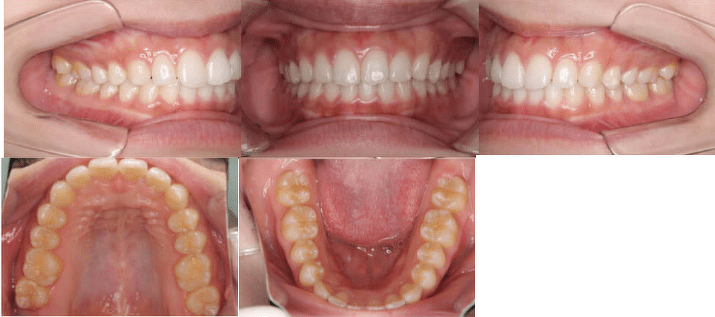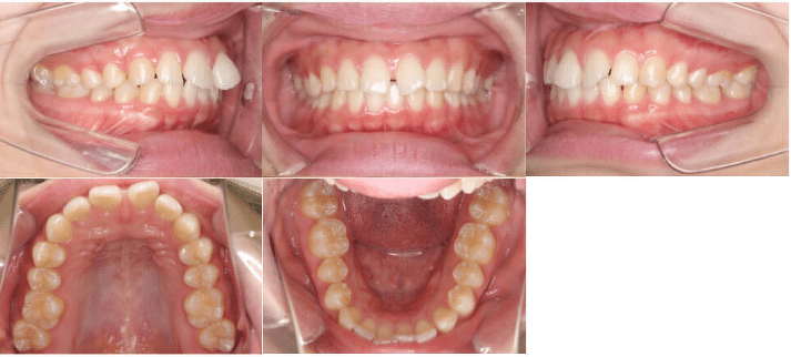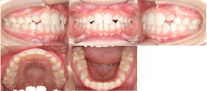 患者さんは前歯の隙間が気になると来院されました。前歯の真ん中に隙間がある「正中離開」と前歯の噛み合わせが深い「過蓋咬合(かがいこうごう)」の症状がみられ、また前歯の間に隙間が空いていることで、前歯の脇のまだ永久歯が生えていない場所が狭くなっていました。